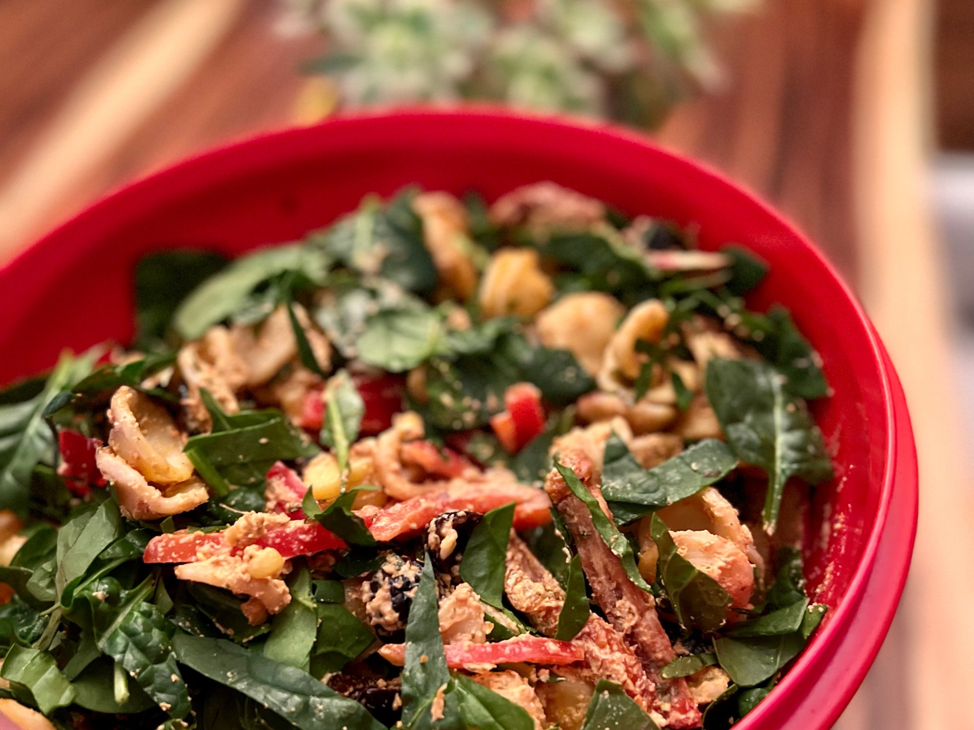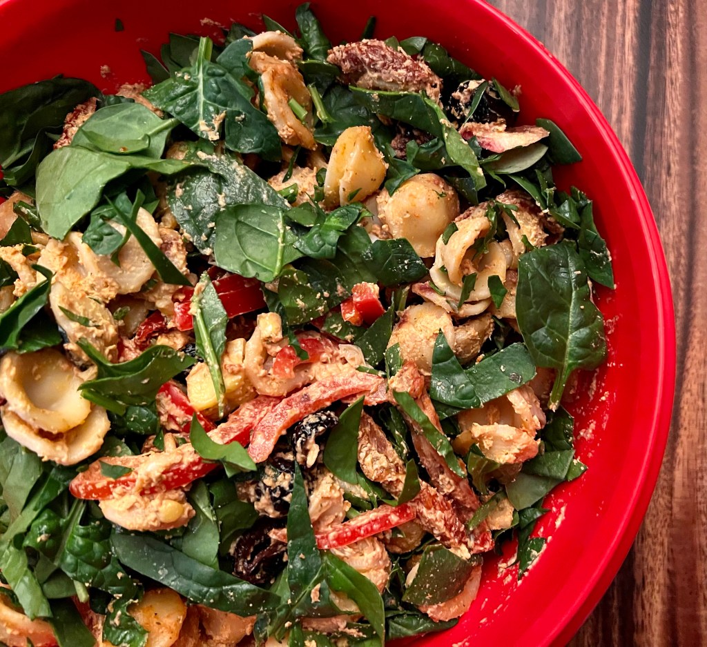 Trancher en lanière le poivron, les épinards et les tomates séchées. Mettre dans un bol de service, avec les olives et le maïs. Ajouter les pâtes cuites.
