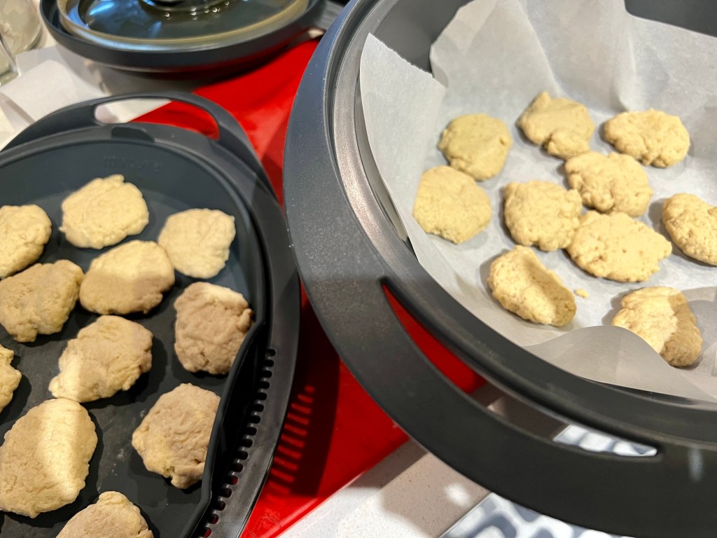 Mettre 800 g d’eau dans le bol du TM. Mettre du papier parchemin sur les plateaux du Varoma et y déposer les croquettes (sur les deux plateaux). Mette l’ensemble Varoma en place et cuire à la vapeur 30 min/Varoma/vitesse 1.