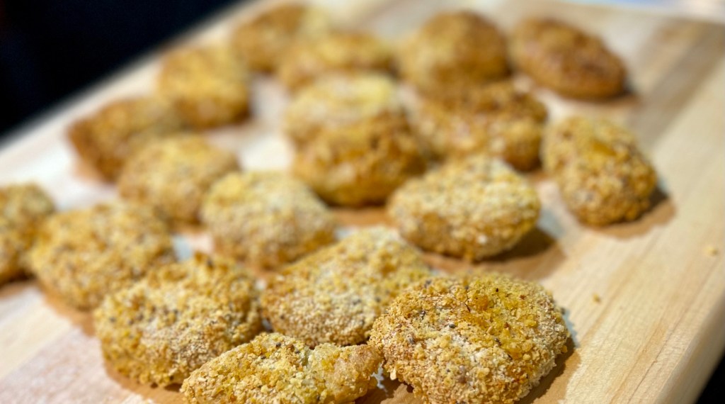 Placer un grand morceau (18 x 18 pouces) de papier parchemin sur le comptoir de la cuisine et y déposer la pâte de seitan. Huiler légèrement les mains si nécessaire pour éviter de coller, puis étirer la pâte en un morceau d’environ 1/3 de pouce d’épaisseur. Utiliser un petit emporte-pièce rond et découper les croquettes ou utiliser les mains et de déchirer de petites pépites de la pâte pour faire des croquettes.