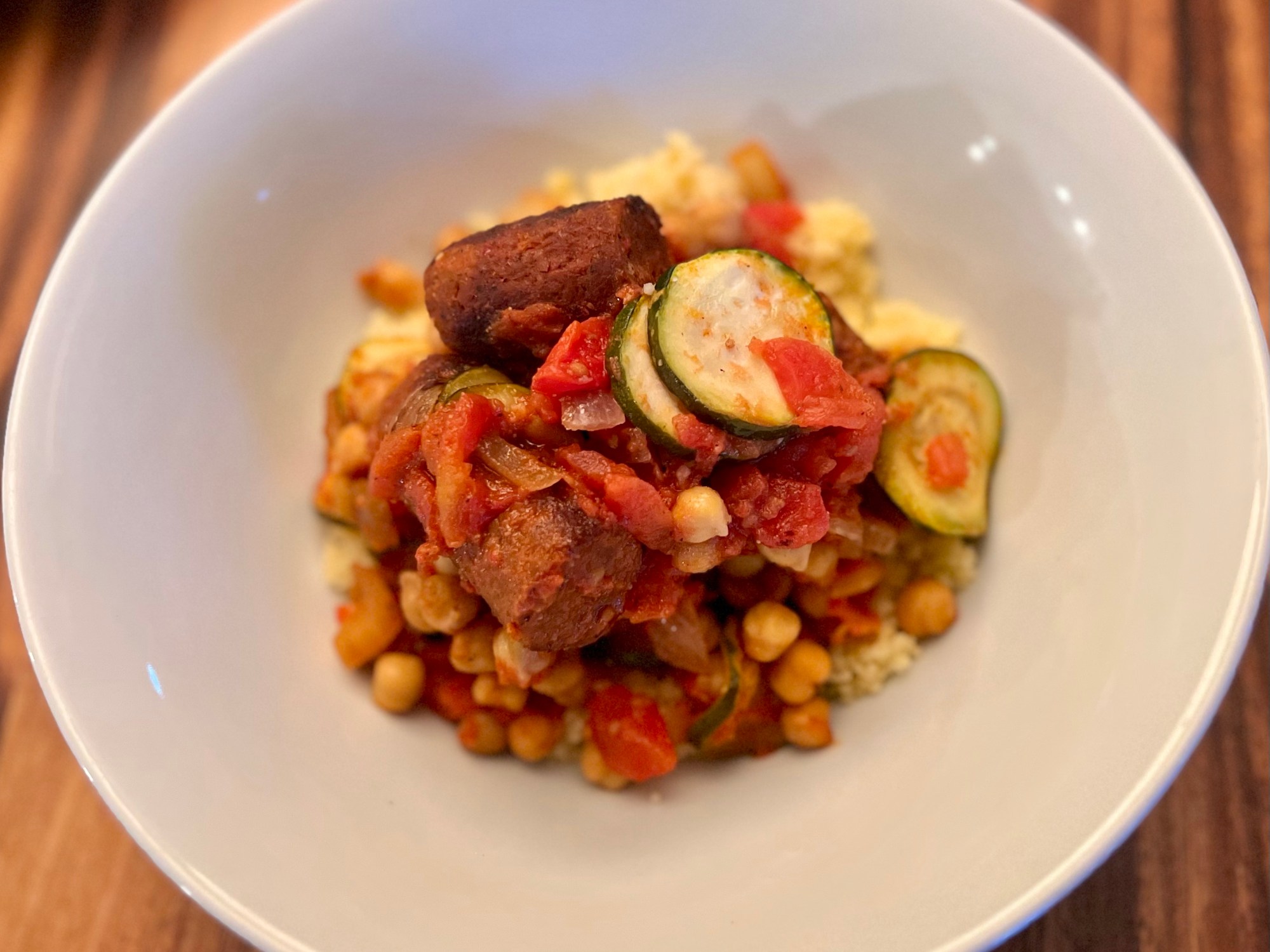 Ajouter le vin blanc, les saucisses, les tomates, le cumin, l’ail haché, le sirop d’érable, les pois chiches, la courgette, la sauce harissa, le sel et le poivre.