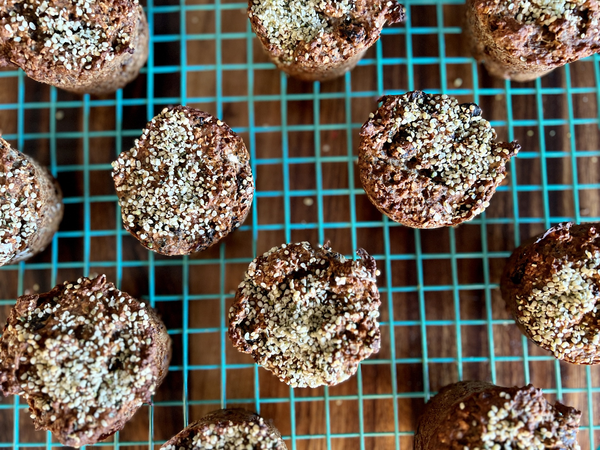 Déposer dans un moule à muffins le mélange (si votre moule n’est pas en silicone, vous pouvez mettre des moules de papier). Ajouter des graines de chanvre sur le dessus. Mettre au four 30 min à 350 F.