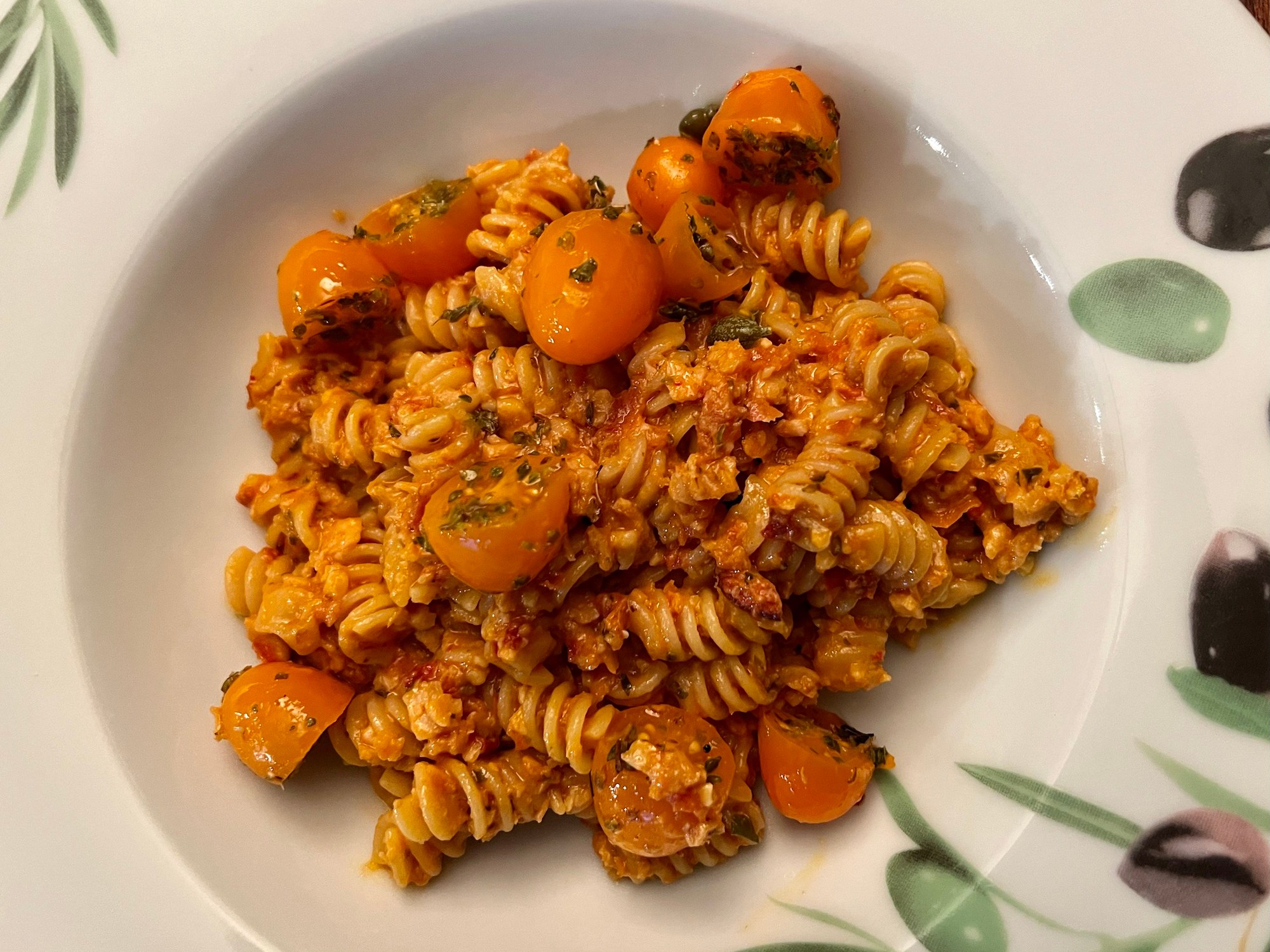 Ajouter le thon végétal Gusta et mélanger. Servir avec la garniture de tomates cerises.