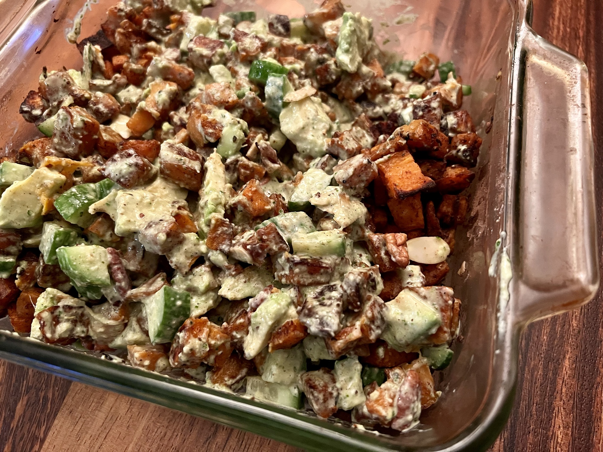 Dans un grand bol, mélanger délicatement tous les ingrédients de la salade avec les patates douces rôties et la vinaigrette.