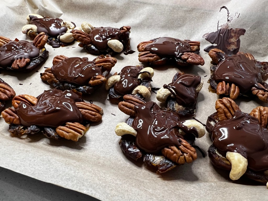 Presser 4 ou 5 noix sur chaque datte et transférer dans une assiette recouverte d’un papier parchemin. Congeler pendant 30 minutes.