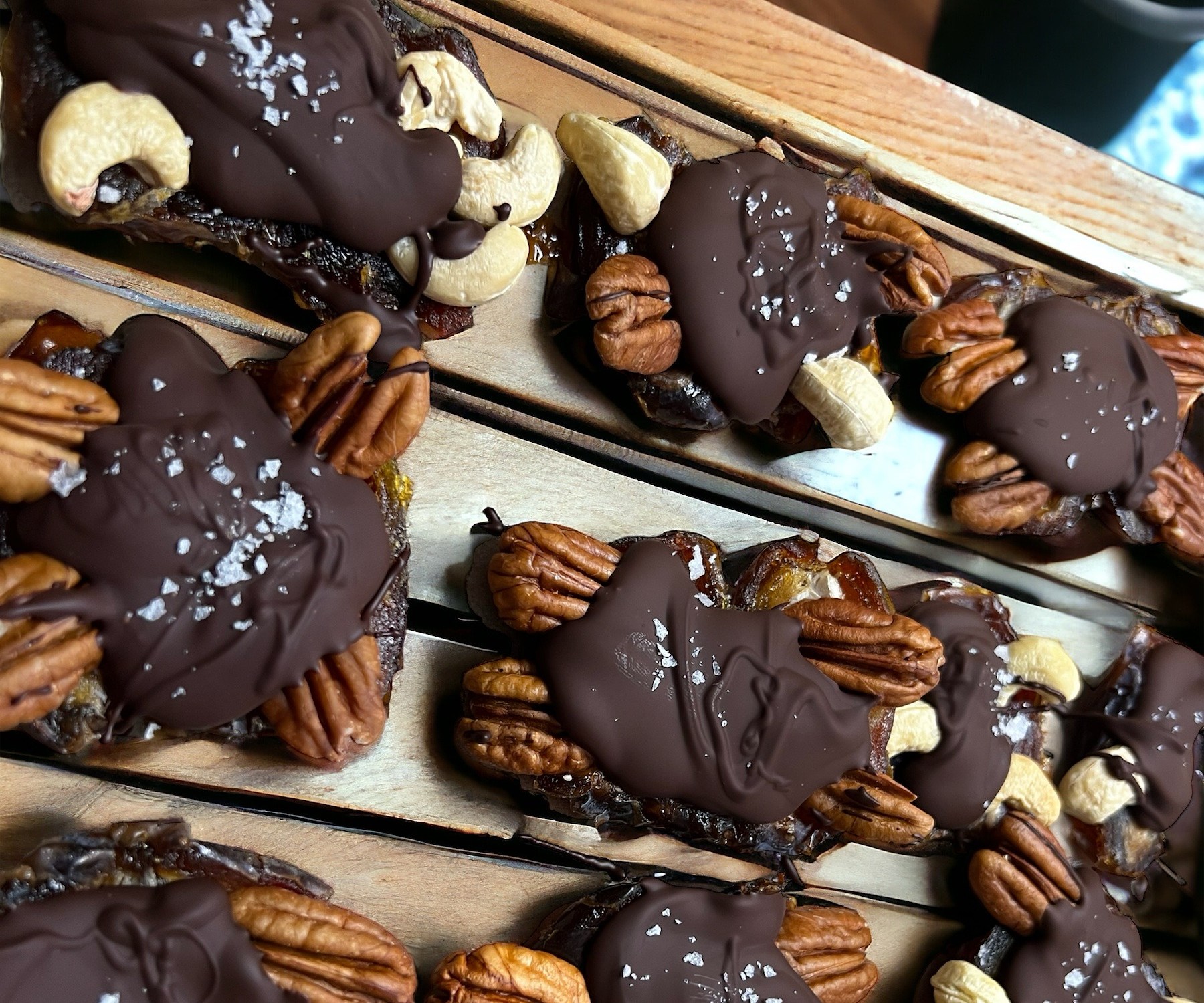 Presser 4 ou 5 noix sur chaque datte et transférer dans une assiette recouverte d’un papier parchemin. Congeler pendant 30 minutes.