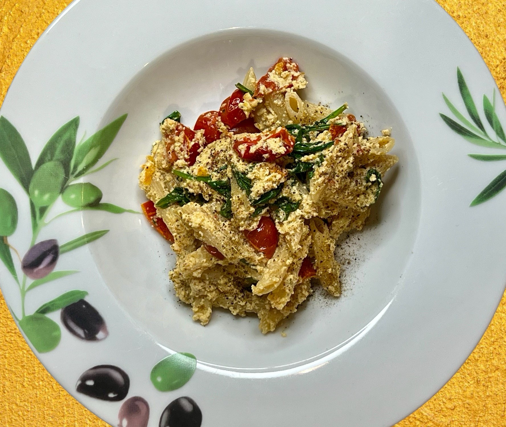 Au sortir du four, remuer avec une cuillère jusqu’à ce que les tomates et la « feta » se mélangent bien et ajouter une poignée d’épinards au mélange. Verser les pâtes et mélanger jusqu’à ce qu’elles soient enrobées de sauce.