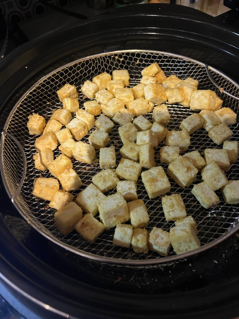 Cuire les dés de tofu dans le panier de l’AirGo, fonction « AirFryer », à 420F, durant 15 minutes. Brasser deux dois durant la cuisson.