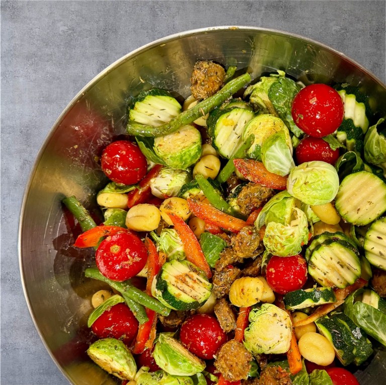 Mélanger le tofu mariné avec le reste des ingrédients dans un grand bol et bien étendre sur la plaque. Mettre au four 25 à 30 minutes, ou jusqu’à ce que le tout soit suffisamment grillé à votre goût.
