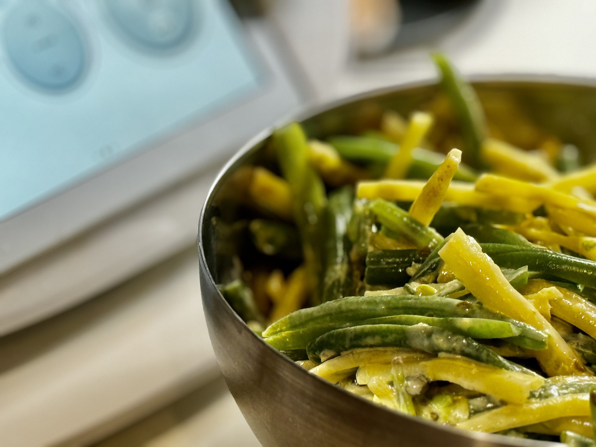 Verser l’eau (500g) dans le bol de mixage. Mettre en place le Varoma, y peser les haricots verts, refermer le couvercle du Varoma et cuire à la vapeur 20-25 min/Varoma/vitesse 2, ou jusqu’à ce que les haricots soient cuits à votre goût.