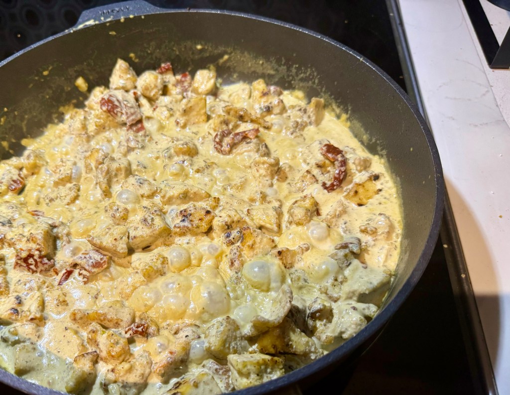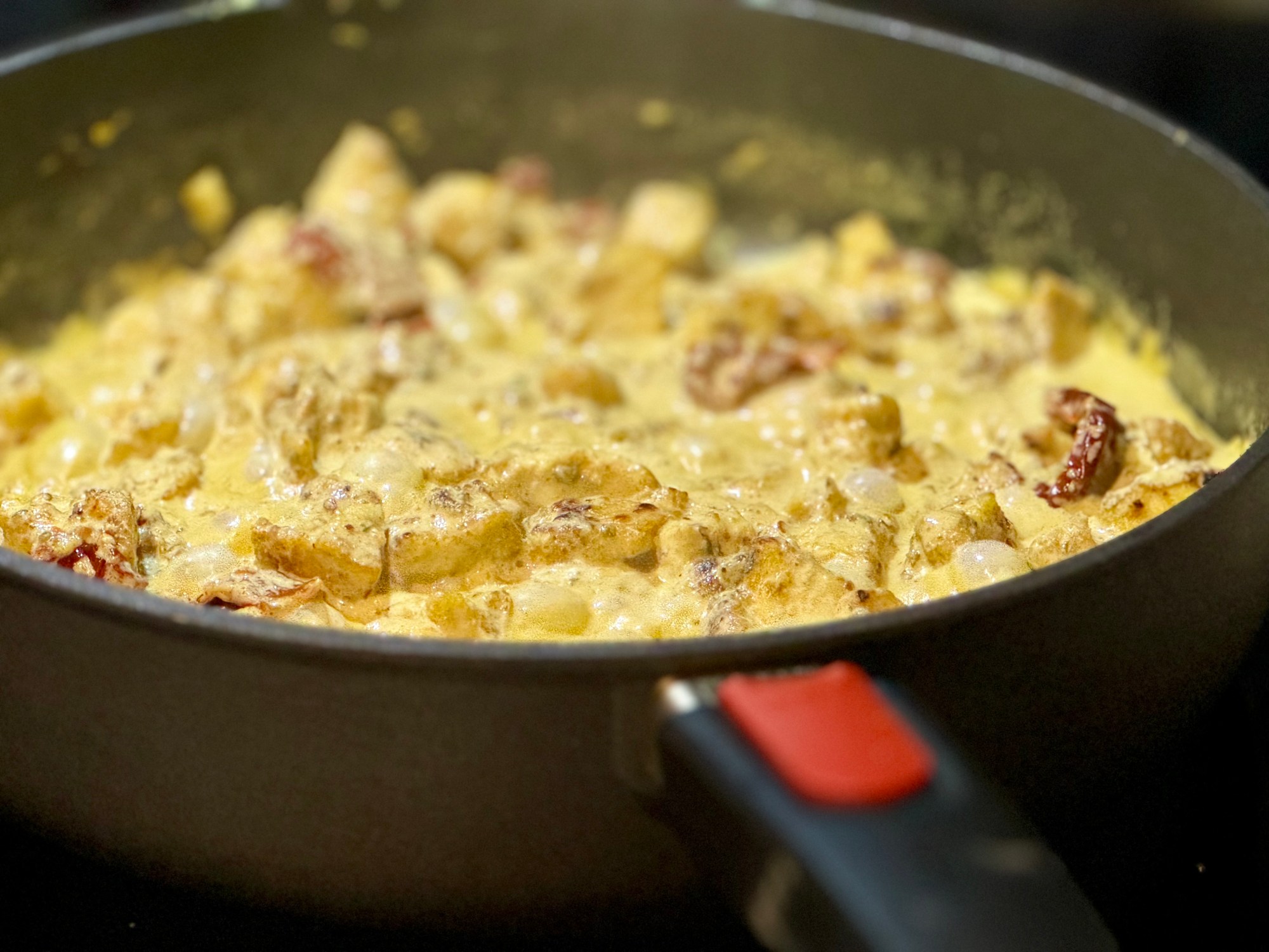 Remettre le tofu dans la poêle avec la sauce et ajouter les tomates séchées au soleil. Chauffer et cuire quelques minutes de plus.