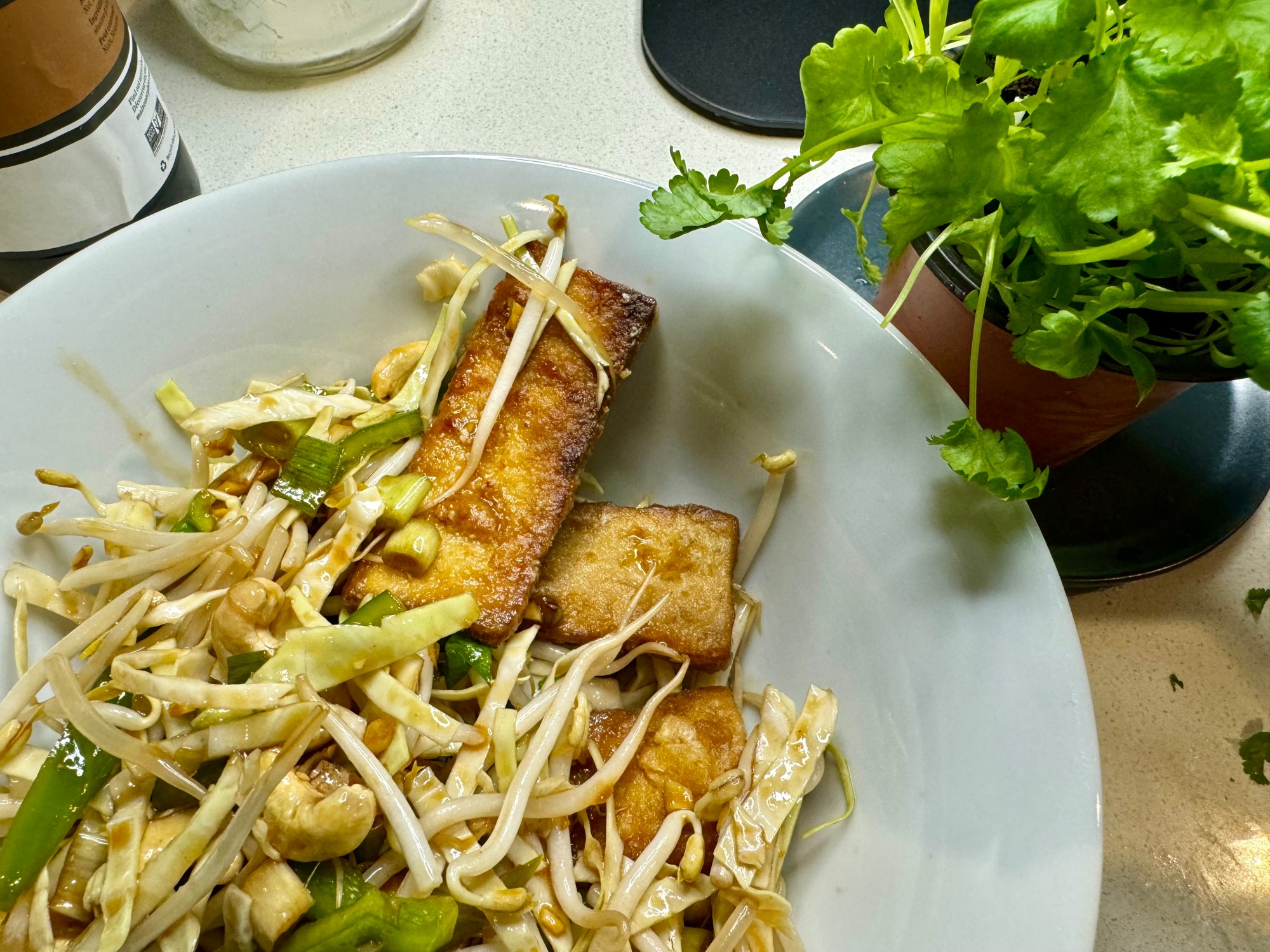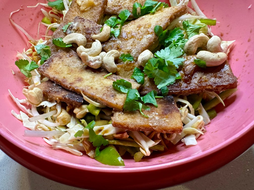Laver et éponger le chou et les fèves germées et les mettre dans un saladier. Couper le poivron en fines tranches et le céleri en dés et combiner le tout aux autres légumes. Ajouter le reste de l’huile à la marinade et verser sur les légumes. Hacher grossièrement les noix de cajou et la coriandre et incorporer à la salade. Saler et poivrer au goût et bien mélanger. Séparer la salade entre quatre bols, laisser la marinade restante dans le fonds. Déposer le tofu cuit sur la salade et verser la marinade sur le tofu et servir.