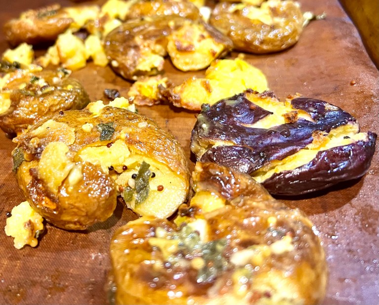 Remuer pour casser un peu les pommes de terre et disposer uniformément sur la plaque. Saupoudrer de sel et de poivre. Cuire au four pendant 30 minutes, jusqu’à ce qu’elles soient dorées et croustillantes par endroits.