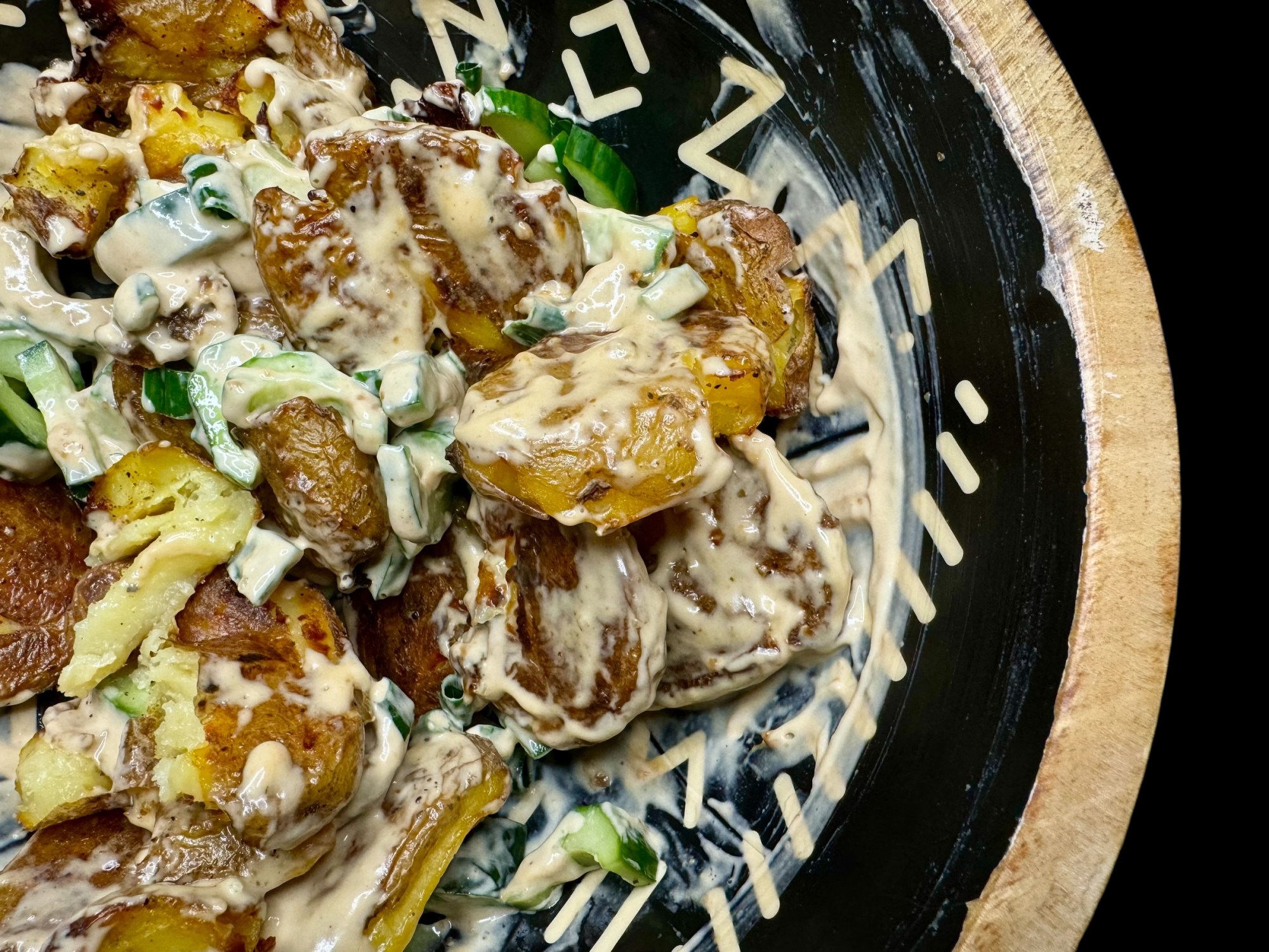 Hacher grossièrement en demi-lunes. Hacher finement l’oignon de printemps. Choisir les feuilles de coriandre. Placer les pommes de terre dans un grand bol avec le concombre, l’oignon vert et les feuilles de coriandre. Ajouter la mayonnaise au sésame et mélanger pour enrober.