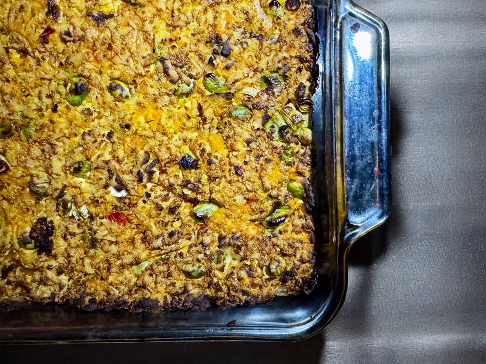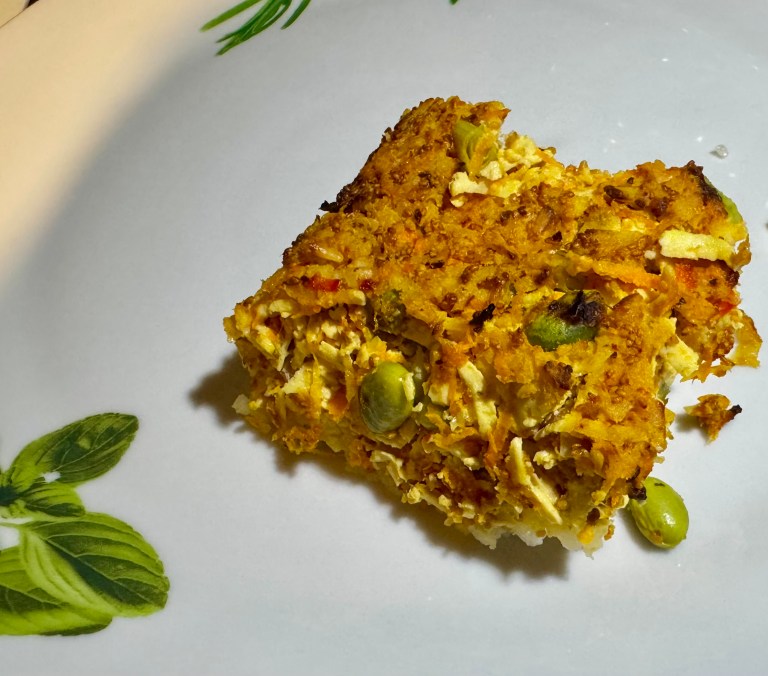 Vaporiser légèrement un plat allant au four et y mettre le riz. Bien aplatir avec une fourchette.