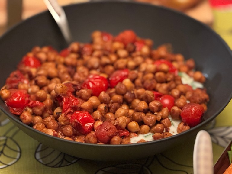 Dans une grande poêle, faites chauffer l’huile à feu moyen jusqu’à ce qu’elle brille. Ajouter les tomates et cuire, en secouant de temps en temps, jusqu’à ce qu’elles soient dorées par endroits et commencent à éclater, 3 à 5 minutes. Ajouter les pois chiches et la poudre de curry et assaisonner de sel et de poivre. Cuire, en remuant de temps en temps, jusqu’à ce qu’elle soit parfumée et que la plupart des tomates aient éclaté, 2 à 4 minutes. Éteignez le feu et assaisonnez au goût avec du sel et du poivre.