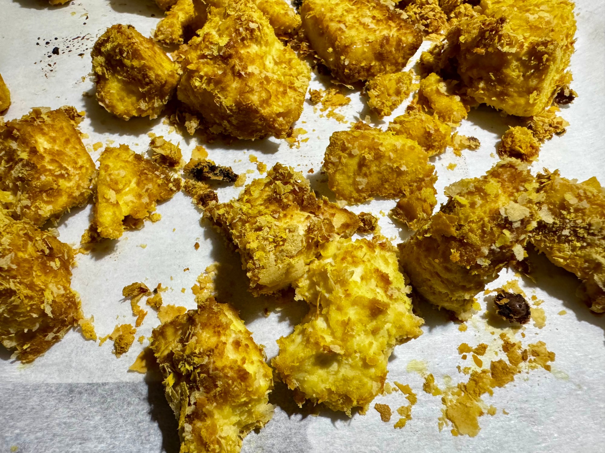 Préchauffer le four à 190 °C (375 °F). Sur une plaque recouverte de papier parchemin mettre les bouchées de tofu. Cuire les bouchées 25 minutes, ou jusqu’à ce qu’elles soient bien dorées.