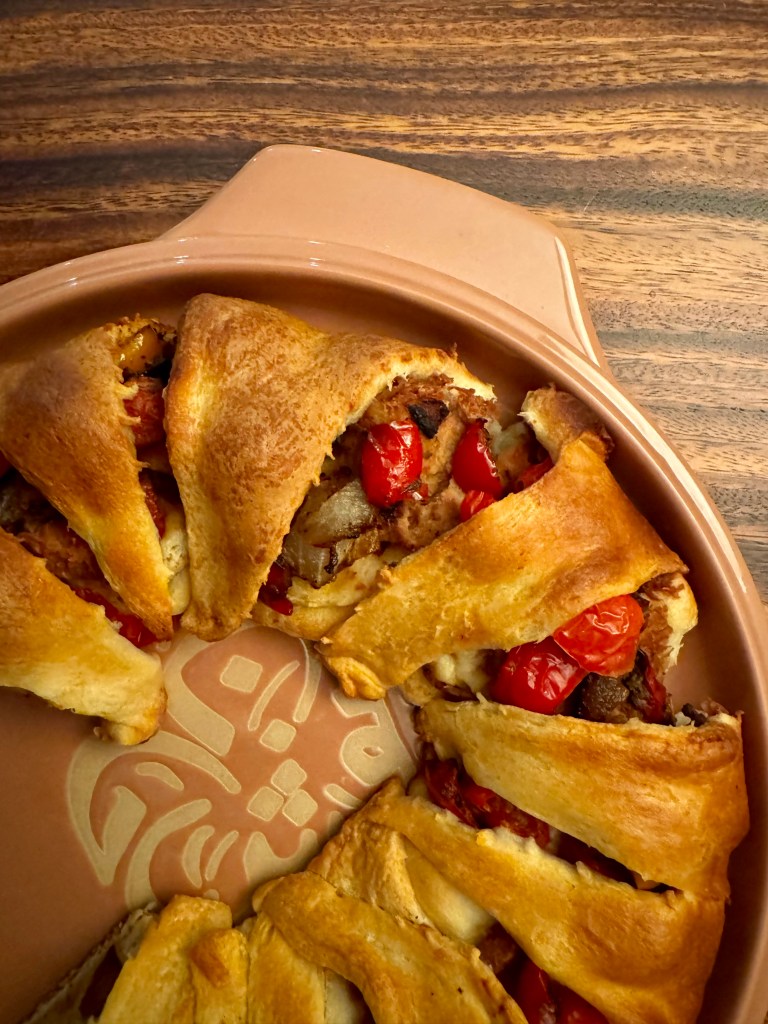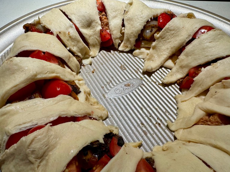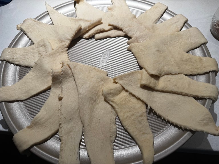 Dérouler les croissants et les disposer à plat sur la plaque à pizza, le côté le plus large vers le centre du plat. (Les croissants doivent se chevaucher d’environ 1,5 à 2 cm en formant un cercle. Laisser un espace au centre d’environ 15-20 cm de diamètre.)