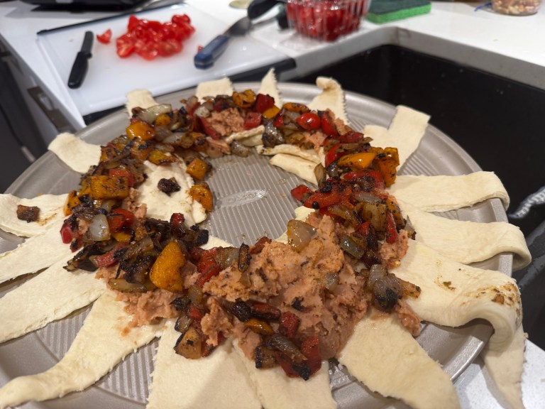 Prendre la pointe extérieure de chaque croissant, repliez-la sur le mélange de haricots et de légumes et glisser sous la partie intérieure de la couronne.