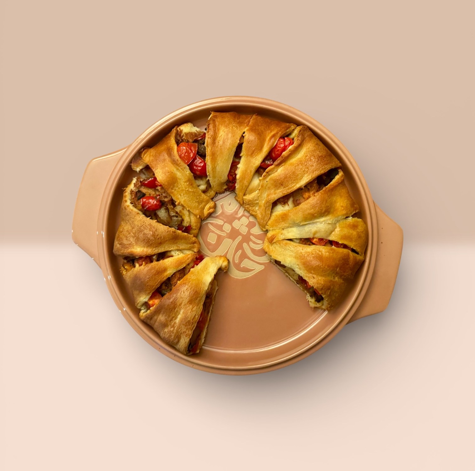 Dérouler les croissants et les disposer à plat sur la plaque à pizza, le côté le plus large vers le centre du plat. (Les croissants doivent se chevaucher d’environ 1,5 à 2 cm en formant un cercle. Laisser un espace au centre d’environ 15-20 cm de diamètre.)