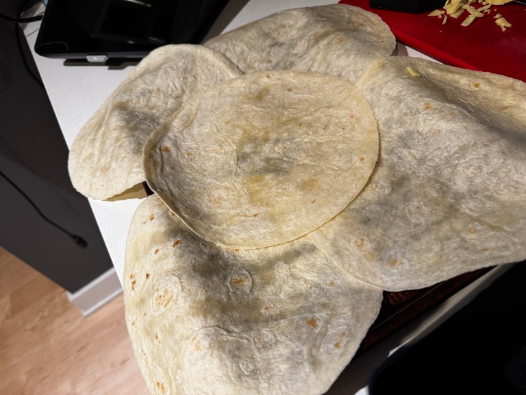 Sur une plaque de cuisson, disposer les tortillas sur les bords de sorte que la moitié de chacune pend sur les côtés.
