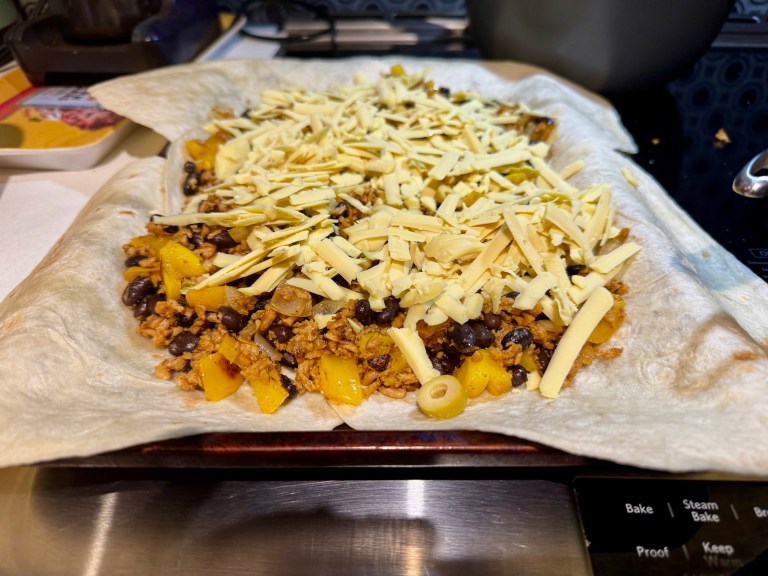 Placer 1 tortilla au centre pour couvrir la poêle. Étaler le mélange de PVT et de légumes uniformément sur les tortillas. Saupoudrer de fauxmages et d’oignons verts. Placer une autre tortilla au centre sur le dessus, puis plier les tortillas en surplomb vers l’intérieur pour couvrir la garniture.