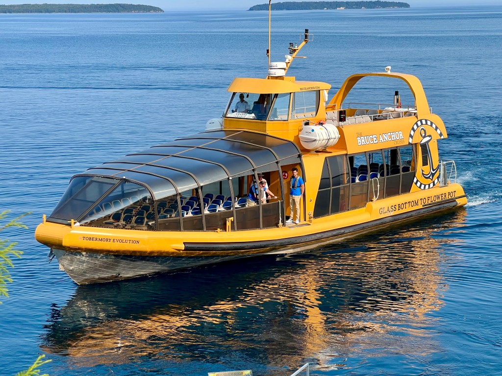 Le bateau nous amène d’abord dans le Big Tub Harbour, une baie où l’on peut voir l’épave du bateau Sweepstakes, l’une des 22 du parc marin Fathom Five. L’eau est si claire qu’on la voit très bien. Si on veut, on peut même l’observer par le fond du bateau qui possède un plancher de verre.