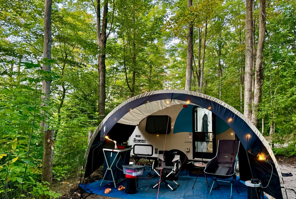 Nous avons été pas mal reclus durant le mauvais temps. Et nos voisins aussi. Alors que le soleil nous accompagne, nous découvrons notre voisinage de roulottes. Les campeurs d’une belle Airstream (mon rêve) à notre gauche, d’une tente-roulotte à droite (toute nouvellement équipée), puis d’une jolie Alto plus loin. Ils parlent tous français et sont franchement sympathiques. Une belle communauté pourrait bien se former ici. Mais dommage, nous repartons demain et nos voisines et voisins aussi. Nous avons même rencontré un couple, propriétaire d’une Hélio qui était au même camping que nous. On a fait connaissance juste avant leur départ, assez pour souhaiter se rencontrer à nouveau. *